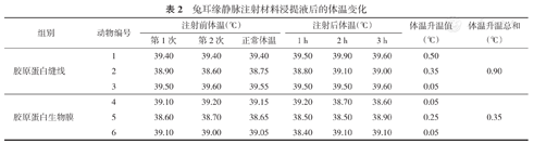取健康成年大白兔6只,每种材料3只。将兔置于固定器内,实验前30 min测体温2次,将肛门体温计插入兔肛门(深度约6 cm)测温,每只兔每次测温时间至少2 min,两次体温之差≤0.7 ℃即符合要求,以这两次体温的均值作为该兔的正常体温。于测定正常体温15 min内自兔耳缘静脉缓慢注射38 ℃预热的材料浸提液(1.0~2.0 ml/kg体质量),注射完毕后每隔1 h测体温1次,共测3次,以3次体温中的最高体温减去正常体温即为该兔的体温升温值。若3只兔中有1只兔的体温升温值≥0.6 ℃,或3只兔的体温升温总和≥1.4 ℃,则另取5只兔复试,方法同上。
