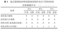 分别将浸有CS和CB浸提液的纱布进行局部斑贴,去除贴敷物后24、48、72 h,观察可见贴敷部位均无红斑和水肿反应,按评分标准记分,结果显示CS和CB的刺激反应均为0分(表3),认为这两种材料的皮肤刺激实验合格。
