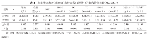 两组患者的临床资料见表2。结果表明,两组患者的性别、年龄、体质量指数(body mass index,BMI)、血糖、血清ApoA1及ApoB水平的差异均无统计学意义(均P>0.05);观察组患者的血清LDL-C、TG、TC水平明显高于对照组,而HDL-C水平明显低于对照组,差异均有统计学意义(均P<0.05)。