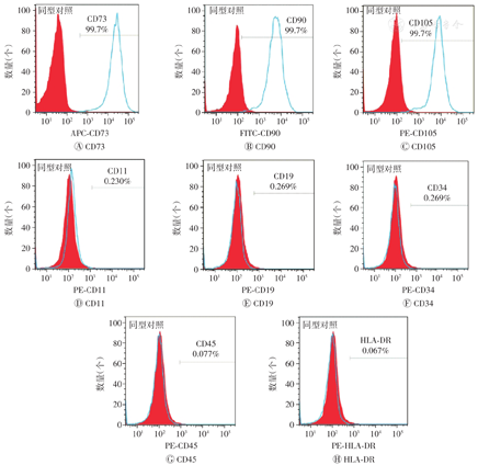 将P5代细胞悬液以2.5×105个/管均分至EP管中,单染抗体CD11、CD19、CD34、CD45、人类白细胞抗原DR(human leukocyte antigen-DR,HLA-DR)各取5 μl,CD73、CD90、CD105各取1.25 μl加入对应的EP管中进行染色,弃上清,杜氏磷酸盐缓冲液重悬后转移至流式管中,最后采用流式细胞仪进行检测。