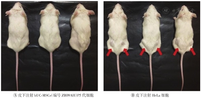 hUC-MSCs—人脐带间充质干细胞。红色箭头所示为成瘤位置