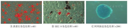 按相应的试剂盒说明书对P5代细胞进行成骨、成脂、成软骨诱导分化21 d,再分别用茜素红、油红O、阿利新蓝进行成骨、成脂、成软骨染色观察。