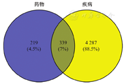 检索后得到浙贝母-金银花药对的成分作用靶点1 560个,汇总并删除重复值后,共得到559个靶点。从疾病数据库得到4 626个靶点。将药物靶点与疾病靶点取交集,得到浙贝母-金银花药对治疗糖尿病足的作用靶点339个。(图1)