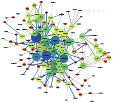 将交集靶点导入蛋白质相互作用数据库(Search Tool for Recurring Instances of Neighbouring Genes,STRING)STRING(https://string-db.org/)分析蛋白质-蛋白质相互作用(protein-protein interaction, PPI),设置参数为combined score>0.9。隐去游离靶点,获取PPI图,并将数据输入Cytoscape 3.7.2软件进行分析,最终获得PPI网络图。