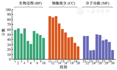 利用基因注释与分析资源网站Metascape(http://metascape.org/)分别进行分子功能(molecular function,MF)、生物过程(biological process,BP)、细胞组分(cell component,CC)的基因本体(gene ontology,GO)富集分析及京都基因和基因组百科全书(Kyoto Encyclopedia of Genes and Genomes,KEGG)信号通路分析,指标为P<0.01。微生信网站(https://www.bioinformatics.com.cn/)制作GO BP-MF-CC及KEGG富集图。