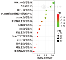 KEGG信号通路分析共得到信号通路172条,依据log q值由降序排列,选择前20条最相关通路制作富集图。(图4)