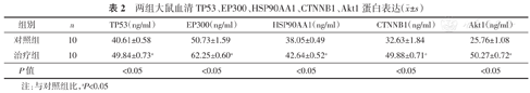 两组大鼠血清TP53、EP300、HSP90AA1、CTNNB1、Akt1蛋白表达(