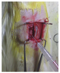 以能量密度为12 J/cm2的激光照射细胞,连续照射3 d,每天2次。然后收集细胞,用生理盐水稀释为2×108~3×108个/ml,4 ℃下储存备用。实验大鼠按每100 g体质量用0.3 ml体积分数为10%的水合氯醛进行麻醉。常规备皮、消毒后,以T9节段为中心用手术刀纵行切开大鼠背部皮肤及皮下组织,咬除T9节段棘突及椎板,露出硬膜。用自制脊髓撞击器(质量10 g)在80 mm的高度下坠落造成脊髓损伤,尾部如果出现一次性摆动并伴随后肢痉挛则视为造模成功。32只脊髓损伤大鼠随机分为脊髓损伤组、干细胞移植组、激光照射组和联合治疗组,每组8只。脊髓损伤组和激光照射组注射0.1 ml生理盐水,在干细胞移植组和联合治疗组大鼠脊髓的硬膜内缓慢注射0.1 ml细胞悬液,注射后停留3 min,缓慢退出针头,用生理盐水清洗创口,并逐层进行缝合。造模成功后,每天早晚对大鼠进行人工排尿。脊髓损伤大鼠干细胞移植过程如图1所示。