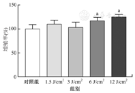 激光照射3 d后,细胞增殖率情况如图2所示。在一定能量密度范围内,hUCMSCs的活性随着能量密度的增加而上升,即可以通过提高能量密度来提升细胞的增殖率。能量密度为6、12 J/cm2时增殖率分别约为117%、125%,与对照组比较差异有统计学意义(均P<0.05)。故选择12 J/cm2的能量密度对细胞进行激光照射后再移植。