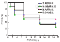 如图3所示,激光照射组的大鼠最晚出现死亡且存活率最高,联合治疗组次之,干细胞移植组的大鼠较早出现死亡且存活率最低,脊髓损伤组和联合治疗组在治疗21 d后的存活率差异无统计学意义(P>0.05)。