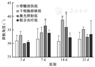 如图4所示,造模后,各组斜板实验数值均降低,随后逐渐恢复。造模后7 d,激光照射组的斜板角度高于脊髓损伤组,差异有统计学意义(P<0.05);造模后14 d,干细胞移植组和激光照射组的斜板角度均高于脊髓损伤组(均P<0.05)。