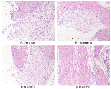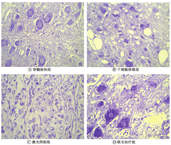 如图6所示,Nissl染色后,脊髓损伤组组织破坏严重,Nissl小体数量减少,染色较淡;干细胞移植组和激光照射组较脊髓损伤组,Nissl体形态和数量有所改善;而联合治疗组虽有一定程度的损伤,但形态有所改善,Nissl小体染色变深。