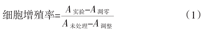 消化、离心收集细胞,并计数制备1×104/ml的细胞悬液,以每孔200 μl的水平接种于96孔板,每组6个复孔。使用635 nm波长的激光进行照射,激光器的输出功率为40 mW,光斑面积为2 cm2,能量密度分别为1.5 J/cm2(照射75 s)、3 J/cm2(照射150 s)、6 J/cm2(照射300 s)和12 J/cm2(照射600 s),参数见表1。每次使光束对4个孔自下而上进行照射,每天照射2次,连续照射3 d。照射结束后,每孔加入噻唑蓝(MTT)溶液20 μl,在37 ℃下避光孵育4 h,弃去原培养液,加入二甲基亚砜(Dimethyl sulfoxide,DMSO)150 μl,摇晃均匀后,用酶标仪在490 nm波长下进行吸光度(A)检测,并按照下列公式计算细胞增殖率。