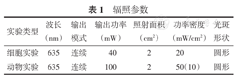 | 实验类型 | 波长(nm) | 输出模式 | 输出功率(mW) | 照射面积(cm2) | 功率密度(mW/cm2) | 光斑形状 |