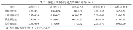 造模后,大鼠运动表现为双后肢拖行,各组BBB评分为0或1分。治疗后,随着时间推移各组评分逐渐升高。造模后1、3和7 d,各组间的BBB评分差异无统计学意义(均P>0.05)。相对于干细胞移植组,其他组大鼠的髋、膝关节活动更广泛。造模后14 d,激光照射组和联合治疗组的部分大鼠能在负重情况下脚背站立,其他两组大鼠的关节活动范围有所增大。造模后21 d,联合治疗组的部分大鼠可以持续性脚掌站立,偶有前后肢协调运动,而其他组大鼠偶有负重脚掌站立,但无前后肢协调运动。各组大鼠在各时间点的BBB评分见表2。