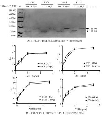 为了分析前期获得的4株PD-L1特异的纳米抗体P3F11、F2H9、P3C8和F3A6是否能够应用于夹心ELISA检测,需要制备含不同标签的PD-L1纳米抗体。将上述抗体基因分别构建到含有HA和c-Myc标签的pET22b表达载体中,转化BL21(DE3)表达菌并进行IPTG诱导表达。经Ni亲和柱纯化后,获得了较高纯度的重组纳米抗体,在SDS-PAGE胶19 000和22 000处分别显示带HA和c-Myc标签的纳米抗体条带,与预期蛋白大小一致(图1A)。为了确定携带不同标签的纳米抗体与PD-L1抗原的结合情况,利用间接ELISA法进行了检测,携带不同标签的纳米抗体均可以与PD-L1抗原结合,且呈浓度相关性(图1B),表明所带标签类型不影响纳米抗体与抗原的结合能力。