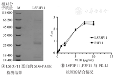 如图2A所示,经SDS-PAGE验证,纯化后的LSP3F11蛋白在18 000、27 000、66 200处均有清晰条带,可能为不同聚合形式的纳米抗体。以P3F11为对照,利用间接ELISA法检测LSP3F11与PD-L1抗原的结合能力(图2B),发现偶联了LS的P3F11对PD-L1抗原的结合与未偶联相比没有显著提高。
