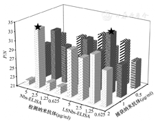 如图4所示,在Nbs-ELISA法中,当P3F11稀释至2 μg/ml,P3C8稀释至2.5 μg/ml时,可得最大P/N值。因此,确定捕获纳米抗体P3F11的工作浓度2 μg/ml,检测纳米抗体P3C8的工作浓度1.25 μg/ml为Nbs-ELISA的最佳工作浓度组合。在LSNbs-ELISA法中,当LSP3F11稀释至1 μg/ml,P3C8稀释至1.25 μg/ml时,可得最大P/N值。因此,确定捕获纳米抗体LSP3F11的工作浓度1 μg/ml,检测纳米抗体P3C8的工作浓度1.25 μg/ml为LSNbs-ELISA的最佳工作浓度组合。