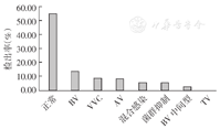 在6 056例阴道微生态检查患者中共检出阴道感染患者2 737例,检出率为45.2%,统计出7种阴道感染类型,其中检出率由高到低依次为BV 841例(13.9%)、VVC 543例(8.9%)、AV 500例(8.3%)、混合性感染356例(5.9%)、菌群抑制328例(5.4%)、BV中间型166例(2.7%)、TV 3例(0.1%),见图1。