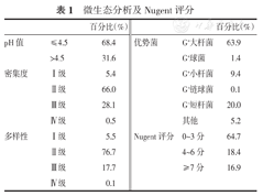 分别从pH值、菌群密集度、多样性、优势菌、Nugent评分5方面进行统计,pH值≤4.5(68.4%),密集度Ⅱ~Ⅲ级(94.1%),多样性Ⅱ~Ⅲ级(94.4%),优势菌以G+大杆菌(63.9%)为主,G-短杆菌(20.0%),G+小杆菌(9.4%),G+球菌(1.4%),G+链球菌(0.1%),其他菌(5.2%)。Nugent评分中0~3分(64.7%),4~6分(18.4%),≥7分(16.9%),见表1。