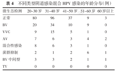本研究显示,BV和VVC仍是临床中发生率较高的类型,同时提示阴道感染与HPV有相关性,因此在预防HPV感染中防治阴道感染亦关键,尤其是对BV的防治;同时也提示临床妇科医生要注重年龄段HPV的筛查,尤其是30~40岁BV患者,对HPV筛查和预防具有重要的临床意义。