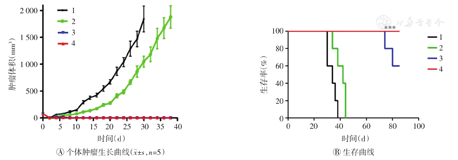 第1次激光照射治疗的同时,手术切除各组荷瘤小鼠大约90%的肿瘤,切口缝合消毒。每2天测量1次小鼠的肿瘤体积,观测其复发情况,并记录小鼠的生存时间。