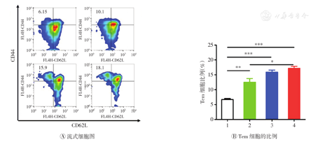 首次治疗30 d后,对各组荷瘤小鼠进行眼静脉取血,然后将其处死,取出脾脏并研磨过筛制成单细胞悬液,用不同荧光素标记的CD3、CD8、CD62L和CD44抗体进行染色,通过流式细胞术分析效应记忆T细胞(effective memory T cell,Tem)的比例。用ELISA检测血清中细胞因子TNF-α和IFN-γ的表达。