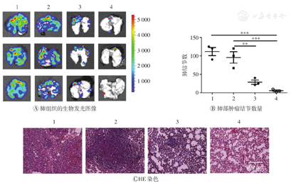首次治疗30 d后,小鼠尾静脉注射4T1-Luc细胞(5×105个/只)。15 d后,各组小鼠腹腔注射生物发光成像相关底物(P1043,3 mg/只),并在注射底物15 min后脱颈处死小鼠,取出各组小鼠的肺组织进行生物发光成像,发光面积越大、发光强度越高,就说明肿瘤的肺转移越多。并对肺组织表面的白色肿瘤结节进行手动计数,之后将各组小鼠的肺组织脱水进行石蜡切片和苏木精-伊红染色(hematoxylin-eosin staining,HE),于显微镜下进一步观察各组小鼠肺部的肿瘤转移情况。