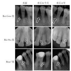 选取2017年7月至2018年11月天津市口腔医院行牙周再生术的牙周炎患者18例,男性10例,女性8例,年龄(39.8±8.7)岁。所有患者和家属均知情并签署同意书。根据骨移植材料不同随机分为3组:同种异体骨修复材料(Bio-Gene)组(n=5)、脱蛋白牛骨矿物基质(Bio-Oss)组(n=8)和胶原基骨修复材料(Bone3)组(n=5)。牙周手术采用局麻下沟内切口,进行翻瓣清创,术中对于牙槽骨缺失的类型再评估,只有2壁及3壁骨袋,同时骨袋深度≥3 mm的牙齿纳入试验。术中植入相应的骨材料后,覆盖Bio-Gide胶原膜,缝合。术后2周拆线。Bio-Oss组有2名患者因全身情况和更换居住地无法复诊而失访。最终共有16名患者纳入4年的长期随访研究。每名患者选取1颗牙作为研究对象,采取双盲的原则,完成手术治疗,并做好牙周清洁,维护口腔卫生,术后6个月、4年进行随访。Bio-Gene组纳入前牙1颗,前磨牙2颗,磨牙2颗,Bio-Oss组纳入前牙1颗,前磨牙2颗,磨牙3颗,Bone3组纳入前牙1颗,前磨牙2颗,磨牙2颗;3组纳入的骨缺损类型均为2壁或3壁骨袋,且位于牙齿的邻面;Bio-Gene组、Bio-Oss组、Bone3组的平均骨缺损深度分别为(5.4±2.30)、(4.0±0.63)、(4.8±0.84)mm,差异无统计学意义,具有可比性。