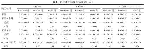 本研究主要评价了牙周再生术中植入不同骨移植材料Bio-Oss、Bio-Gene和Bone3后长期随访的临床疗效,观察牙周的临床指标及影像学指标变化,为临床治疗提供更多选择。结果发现:3种植骨材料在牙周再生术后,PD减少3.00~3.33 mm,CAL改善2.80~3.83mm,GR的改变在0.1~0.75,表明3种骨移植材料对于牙周垂直骨缺损均有良好的长期效果。