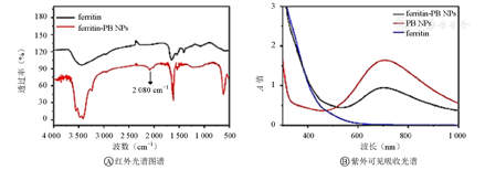 如图2A所示,相比于铁蛋白,ferritin-PB NPs的红外光谱图谱在2 080 cm−1处出现1个新的吸收峰,归属于Fe-C-N-Fe的特征结构。如图2B所示,在ferritin-PB NPs的紫外可见吸收光谱中同时出现属于铁蛋白和PB NPs的特征吸收。红外光谱和紫外可见吸收光谱结果均证实所制备得到的材料中包含铁蛋白和PB NPs 2个关键组分。
