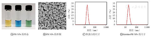 如图3A所示,铁蛋白溶解在水中为黄色透明溶液,PB NPs的溶液呈蓝色,制备得到的ferritin-PB NPs溶液表现为深绿色。透射电子显微镜图像(图3B)表明,ferritin-PB NPs表现出PB NPs被包裹在铁蛋白腔中的形貌结构。动态光散射仪检测结果表明铁蛋白和ferritin-PB NPs的直径分别约为16、18 nm(图3C、图3D),进一步证实ferritin-PB NPs可形成并单分散,大小与铁蛋白相似的纳米结构。