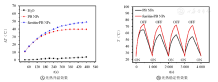 首先制备PB NPs和ferritin-PB NPs溶液(普鲁士蓝等效质量浓度10 mg/ml),用730 nm激光(功率1.5 W/cm2)照射,并用热成像仪记录溶液的温度变化。纳米材料能够实现有效的光热治疗的另一关键性决定因素是材料本身的光热稳定性,评价实验为通过用730 nm激光(功率1.5 W/cm2)照射样品溶液500 s后关闭,冷却500 s,共重复4个循环周期,并用热成像仪记录溶液的温度变化。