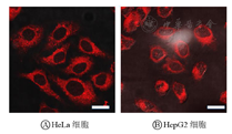 罗丹明B标记的ferritin-PB NPs在肿瘤细胞中的摄取实验通过激光共聚焦显微镜进行观察。取生长对数期的HepG2细胞和HeLa细胞分别重悬成细胞悬液(2×105/ml),并分别接种于玻底共聚焦显微镜测试培养皿中,孵育过夜使细胞贴壁后,将培养基替换为含罗丹明B标记的ferritin-PB NPs (普鲁士蓝等效质量浓度为35 mg/L)的完全培养基,孵育6 h后,置于激光共聚焦显微镜下观察罗丹明B标记的ferritin-PB NPs在不同肿瘤细胞中的摄取情况。