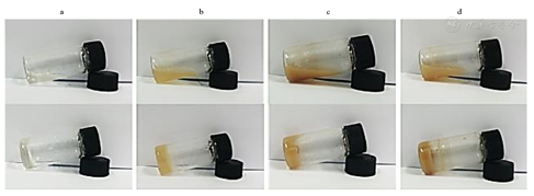 如图1所示,因为三七粉分散在水中为黄色的,随着三七粉含量的增加,PN/CMC/GMs的颜色逐渐加深。上层为PN/CMC/GMs形成的前驱体溶液,将小瓶斜放,小瓶中的液体为倾斜的,而放于室温下半小时后再将小瓶斜放,液体不流动,变为固体,说明形成了PN/CMC/GMs。