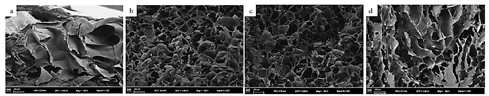 从图2可以看出,PN/CMC/GMs呈相互交通连接的网格状结构,具有一定的孔隙率。不含三七粉的PN/CMC/GMs孔洞没有规整性,而当加入三七粉后,PN/CMC/GMs的孔洞结构明显,形成了具有一定规则的小孔。随着三七粉含量的增加,PN/CMC/GMs的孔隙率减小。