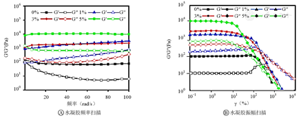 放于相应的模具制备流变样品,在流变仪(直径25 mm)上进行水凝胶的流变学测试,测量全部样品,2个板的缝隙固定在1 000 µm;在1%应变下,以0.1~100 rad/s进行频率扫描表征。在频率为6.283 rad/s时,测定应变0.1%~125%的模量变化。