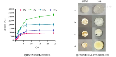 如图4所示,不含三七粉的PN/CMC/GMs可膨胀近10倍(图4a),而在PN/CMC/GMs中添加1%的三七粉时,其膨胀率达到了(3 288±247)%(图4b),而当三七粉的含量增加时,其吸水率降低,含3%三七粉时,PN/CMC/GMs的膨胀率为(2 172±161)%(图4c),而含5%三七粉时,PN/CMC/GMs的吸水率为(1 247±97)%(图4d)。
