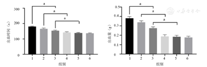 1—空白对照组;2—0% PN/CMC/GMs组;3—1% PN/CMC/GMs组;4—3% PN/CMC/GMs组;5—5% PN/CMC/GMs组;6—阳性组;PN/CMC/GMs—三七的壳聚糖/明胶水凝胶复合止血材料。aP<0.001