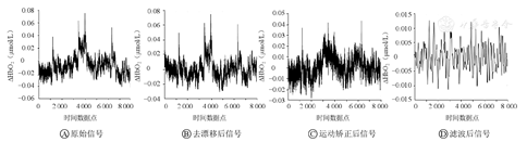 在采集信号过程中会存在生理干扰与基线漂移现象,因此在进行统计分析之前,需要将信号进行预处理。首先从数据中去除伪迹,以此减少在数据采集过程中产生的伪迹和生理伪迹。随后进行去漂移,使用多项式回归模型估计非线性趋势,从原始信号中减去该趋势,以此去除近红外信号的基线漂移噪声。然后将去漂移后的数据进行运动伪迹矫正,使用时间导数分布修复(temporal derivative distribution repair,TDDR)进行矫正,可以减少运动伪迹对相关近红外数据的影响。最后进行滤波,通常使用三阶Butterworth滤波器进行0.01~0.3 Hz的带通滤波,可以滤除大部分生理噪声。各步预处理的结果见图3。