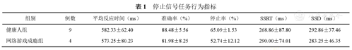 | 组别 | 例数 | 平均反应时间(ms) | 准确率(%) | 停止率(%) | SSRT(ms) | SSD(ms) |