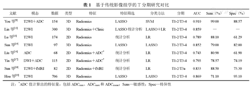 | Sun等[14] | T2WI | 97 | 3D | Radiomics | LASSO | LASSO | T1-2/T3-4 | 0.852 | 79.00 | 82.00 |