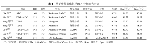 | Li等[24] | T2WI+ADC | 162 | 3D | Radiomics+Clinic | LASSO | SVM | N0/N1-2 | 0.884 | 83.30 | 82.90 |