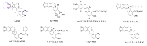 小檗碱又称黄连素,是从传统中草药黄连中提取分离得到的一种异喹啉类季铵型生物碱,其化学结构中独特的四环骨架是由2个异喹啉环稠合而成[4],且在C-2和C-3位存在一个亚甲基双氧桥环状结构。小檗碱主要以盐酸盐形式存在,为黄色结晶性粉末,其在水中的溶解度较小,而易溶于沸水。由于受到植物资源的限制,目前化学全合成的方法逐渐成为制备小檗碱的主要方式[5]。小檗碱的C-8、9、12、13位可以发生烷基化或酰基化的取代反应,从而连接不同的化学基团,如烷基链、唑类化合物、萜烯基以及氮杂环等,形成各种结构相近的小檗碱衍生物(图1)。小檗碱主要用于治疗胃肠炎、细菌性痢疾等肠道感染,也被国家药品监督管理局批准作为调血脂新药开展临床研究,取得了很好的效果。现代药理学研究表明小檗碱及其衍生物具有抗肿瘤、抗病毒、抗氧化、抑菌抗炎、抗心律失常、调节血糖和脂质代谢以及抗动脉粥样硬化等药理活性[6,7,8]。构效关系研究发现小檗碱C-2、3位的亚甲氧基,C-7位带正电的季铵离子以及C-9、10位的甲氧基是小檗碱发挥抑菌抗炎、抗病毒、抗肿瘤以及降糖作用的药效团[6,9,10,11]。近年来,多项基础研究和临床实践的结果显示小檗碱及其衍生物在预防动脉粥样硬化领域具有潜在的应用价值,引起了国内外学者的广泛关注。本文从调脂作用、抑制氧化应激与炎症反应、改善内皮功能障碍和调节肠道微生物群4个方面阐述了小檗碱在预防动脉粥样硬化作用机制研究中的最新进展,为动脉粥样硬化症的临床防治及药物开发提供新思路。