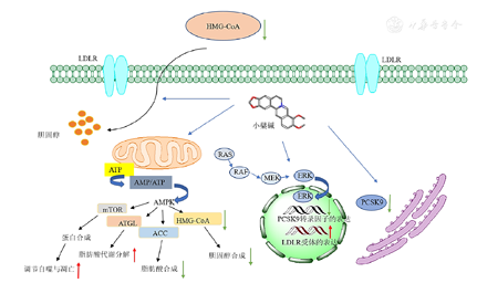 LDLR广泛分布于肝和动脉壁细胞等全身各组织的细胞膜表面,它可以调控LDL的胞吞作用,将细胞外的胆固醇摄取到细胞内,减少血浆中的LDL胆固醇(LDL cholesterol,LDL-C),从而避免血管内皮发生脂质沉积所导致的动脉粥样硬化。小檗碱作为新型的调脂类药物,可通过诱导肝脏LDLR的表达来增加LDL的摄取,从而降低胆固醇水平,防止脂质积累。此外,研究发现小檗碱还能够激活细胞外信号调节激酶(extracellular signal-regulated kinase,ERK),上调LDLR mRNA的表达,从而增加肝脏中的LDLR,其活性位点位于LDLR mRNA 3’非翻译区的5’近端部分[12]。