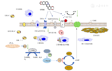 ATP—三磷酸腺苷;ADP—腺苷二磷酸;LDL—低密度脂蛋白;LDL-C—LDL胆固醇;TNF-α—肿瘤坏死因子-α;cPLA2—胞浆型磷脂酶A2;ROS—活性氧;NOS—一氧化氮合酶;eNOS—内皮型一氧化氮合成酶;NADP—烟酰胺腺嘌呤二核苷酸磷酸;NADPH—还原型烟酰胺腺嘌呤二核苷酸磷酸;PGC—鸟苷酸环化酶;cGMP—环磷酸鸟苷;sGC—可溶性鸟苷酸环化酶;NO—一氧化氮