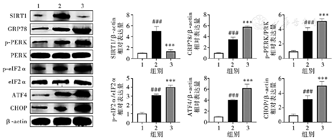 SAH—蛛网膜下腔出血;SIRT1—sirtuin 1;GRP78—葡萄糖调节蛋白78;p-PERK—磷酸化蛋白激酶R样内质网激酶;p-eIF2α—磷酸化真核细胞翻译起始因子2α;ATF4—活性转录因子4;CHOP—C/EBP同源蛋白;1—假手术组;2—模型组;3—sirtnol组。与假手术组相比,###P<0.001;与模型组相比,***P<0.001