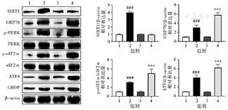 每组6只,取小鼠右侧大脑组织在RIPA裂解液中匀浆,4 ℃下12 000 r/min离心10 min。使用BCA蛋白定量试剂盒检测蛋白浓度。10% SDS-聚丙烯酰胺凝胶上进行电泳(每组40 μg蛋白),并转移至PVDF膜上,然后在室温下采用5% BSA封闭1 h。将PVDF膜在4 ℃分别与SIRT1(1∶500)、GRP78(1∶200)、p-PERK(1∶1 000)、PERK(1∶800)、p-eIF2α(1∶500)、eIF2α(1∶200)、ATF4(1∶200)和CHOP(1∶200)一抗抗体孵育过夜。TBST洗涤后,与二抗在室温下孵育1 h,用ECL发光液显影,采用Image J软件分析免疫印迹条带的相对密度。