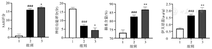 SAH—蛛网膜下腔出血;SIRT1—sirtuin 1;1—假手术组;2—模型组;3—sirtnol组。与假手术组相比,###P<0.001;与模型组相比,*P<0.05,**P<0.01
