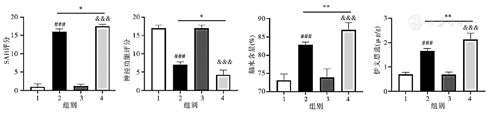 SAH—蛛网膜下腔出血;SIRT1—sirtuin 1;1—假手术+siRNA对照组;2—模型+siRNA对照组;3—假手术+SIRT1 siRNA组;4—模型+SIRT1 siRNA组。与假手术+siRNA对照组相比,###P<0.001;与模型+siRNA对照组相比,*P<0.05,**P<0.01;与假手术+SIRT1 siRNA组相比,&&&P<0.001